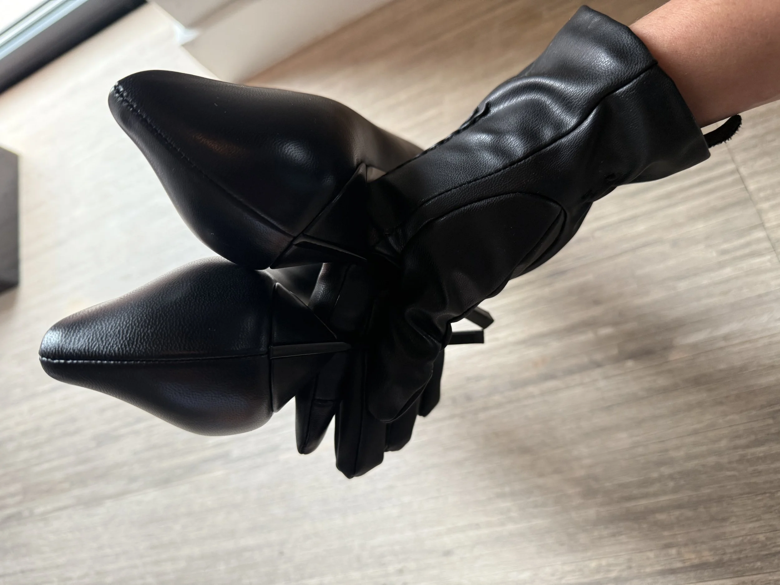The soft snap of latex breaking free from a tight fit echoed through the dimly lit room. Mistress Lisa stood by the sleek black counter, her gloved fingers flexing, testing the stretch, feeling the way the thin material clung to her skin like a second layer of command.